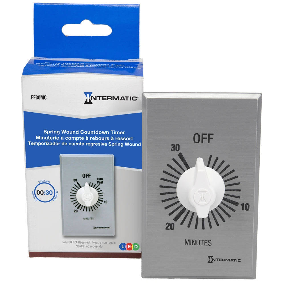 Temporizador de cuenta regresiva con resorte, comercial, 125-277 V CA, 50/60 Hz, SPST, 30 minutos máximo, sin espera, plata